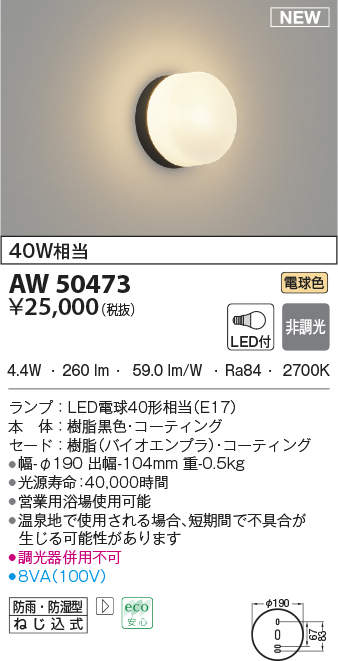 ●商品の関連商品や機能説明などPC用ページに切り替えてご確認下さい 下記リンクから移動出来ます↓↓↓↓↓↓ [ 人気 商品 検索 画面 はこちらから ] 広さ6畳までのおすすめ!広さ8畳までのおすすめ!広さ10畳までのおすすめ! 広さ12畳までのおすすめ!広さ14畳以上のおすすめ!小型タイプ(玄関・廊下・トイレなど) ●関連商品 営業用浴室灯AW48067L 電球色防雨・防湿型 LEDランプ交換可能型 白熱電球40W相当27,106円営業用浴室灯AW48068L 電球色防雨・防湿型 LEDランプ交換可能型 白熱電球40W相当27,106円営業用浴室灯AW50470 電球色防雨・防湿型 LEDランプ交換可能型 白熱電球60W相当20,185円営業用浴室灯AW50471 電球色防雨・防湿型 LEDランプ交換可能型 白熱電球60W相当20,185円営業用浴室灯AW50472 電球色防雨・防湿型 LEDランプ交換可能型 白熱電球40W相当14,417円 営業用浴室灯AW50473 電球色防雨・防湿型 LEDランプ交換可能型 白熱電球40W相当14,417円