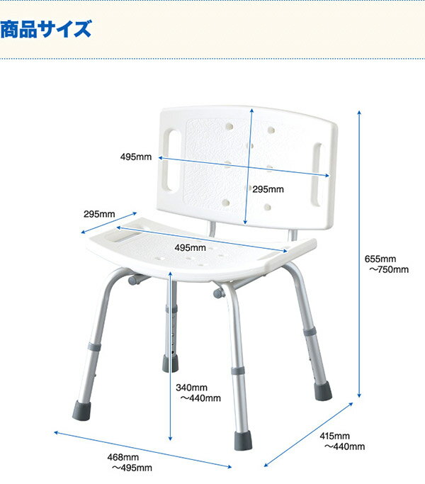 [こんな商品をお探しの方に] シャワーチェア 風呂イス 介護 入浴用イス お風呂チェア お風呂椅子 浴室 浴槽 バスチェア シャワーベンチ 背もたれ 背付き 風呂いす 風呂イス 高さ調整 アルミ製 軽量 介護イス 介護チェアー 入浴用チェア お風呂 椅子 浴用 シャワーチェアー シャワースツール 介護 介護用品 入浴補助老人ホーム 介護施設 福祉施設 保育施設 介護用 業務用 デイサービス 病院 リハビリ支援 リハビリ補助 介護 介助 介護用品 福祉 リハビリ 補助 補助器具 サポート 安全 おしゃれ おすすめ 人気 高齢者 お年寄り シルバー シルバー用品 敬老の日 父の日 母の日 誕生日 お祝い プレゼント ギフト 贈り物 サイズ(約): 最大時:幅495mm×奥行440mm×高さ750mm最小時:幅468mm×奥行415mm×高さ655mm 座面の高さ(約): 5段階調節(340mm/365mm/390mm/415mm/440mm) 材質: 座面、背もたれ:ポリエチレン フレームパイプ:アルミニウム 高さ調整ボタン:ステンレス パイプキャップ:ポリプロピレン 脚ゴム:E-SBR(乳化重合スチレン・ブタジエンゴム) 重量(約): 2.9kg 最大使用者体重: 100kg未満 特記事項: ※座面の上に立ったり、脚をかけたり、飛び乗ったりしないでください。